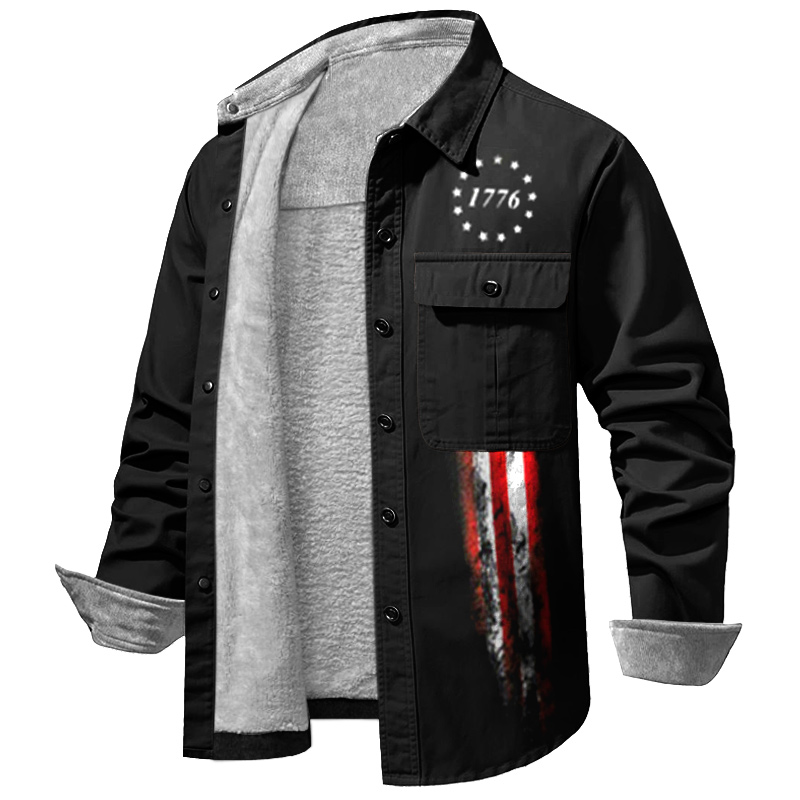 Men's Fleece Shirt Jacket Vintage 1776 American Flag Printed Corduroy Patch Pockets